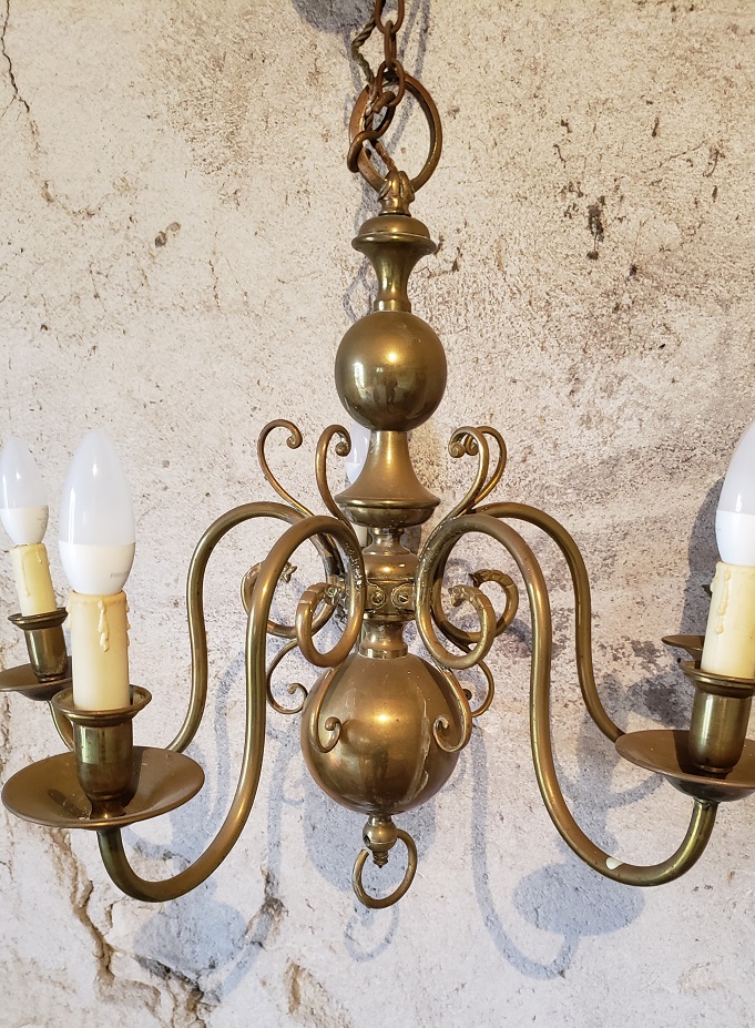 Grand lustre en bronze doré à quatre bras de lumière décoré de volutes, de fleurs en boutons et de feuilles de lauriers. H 80 Larg 43