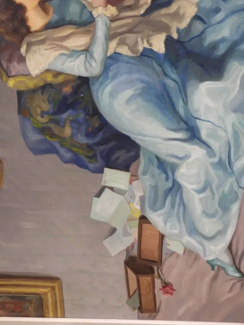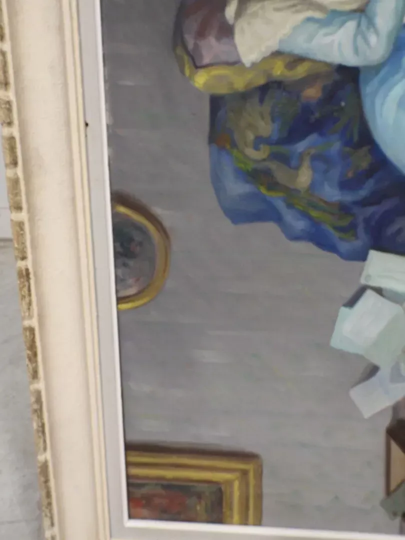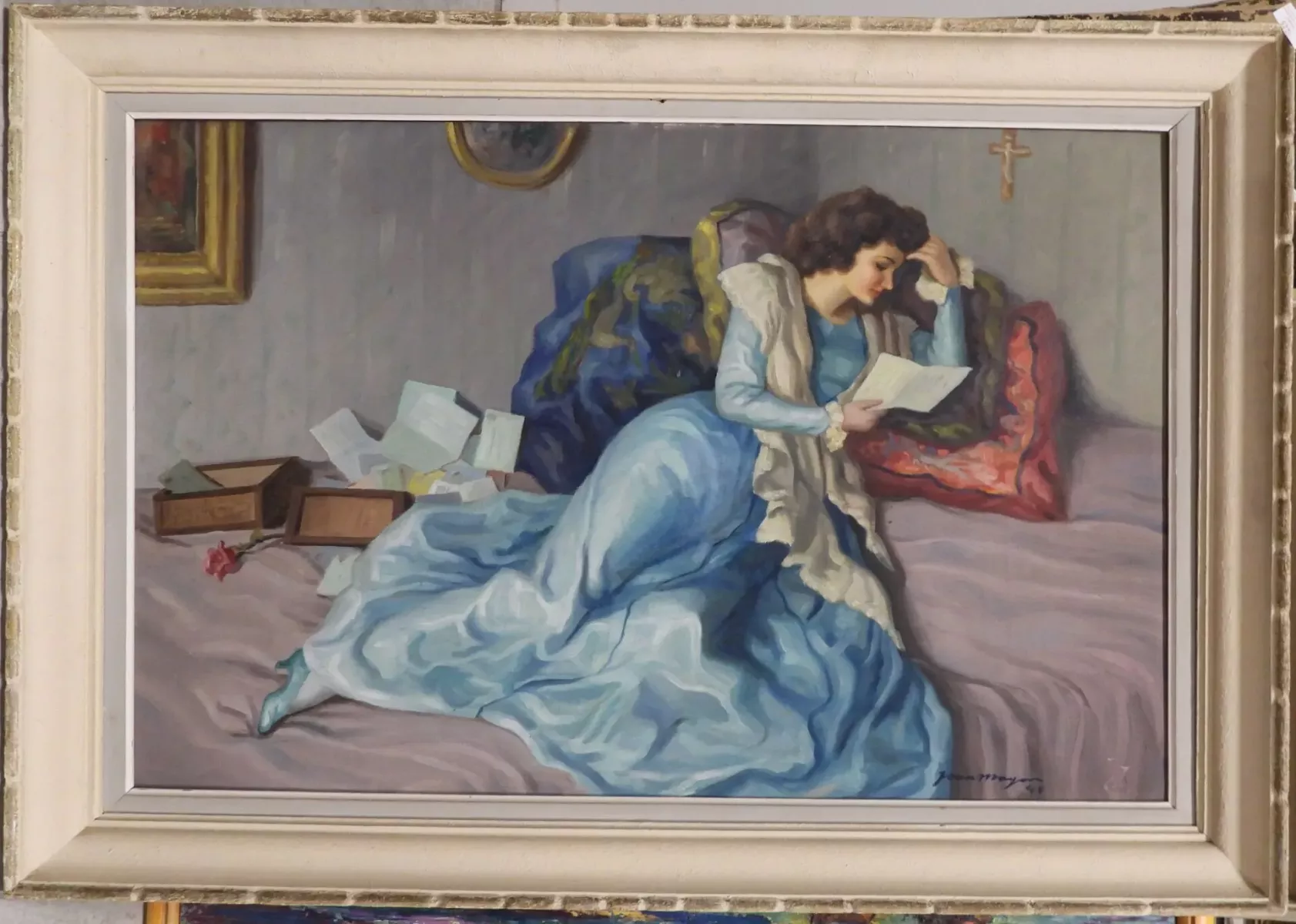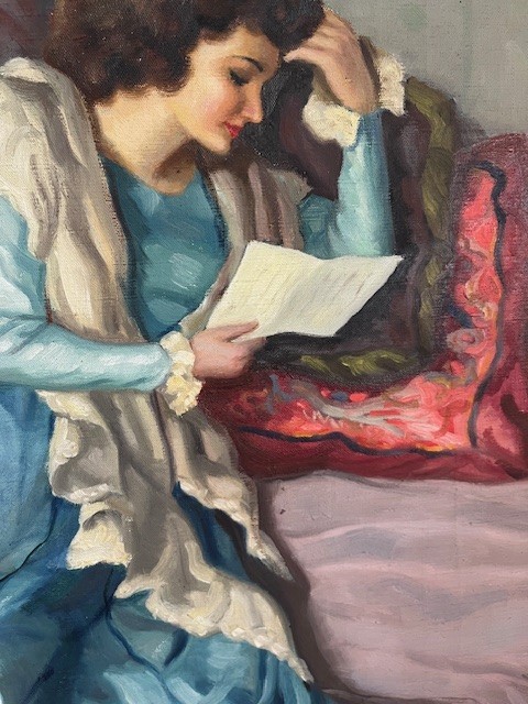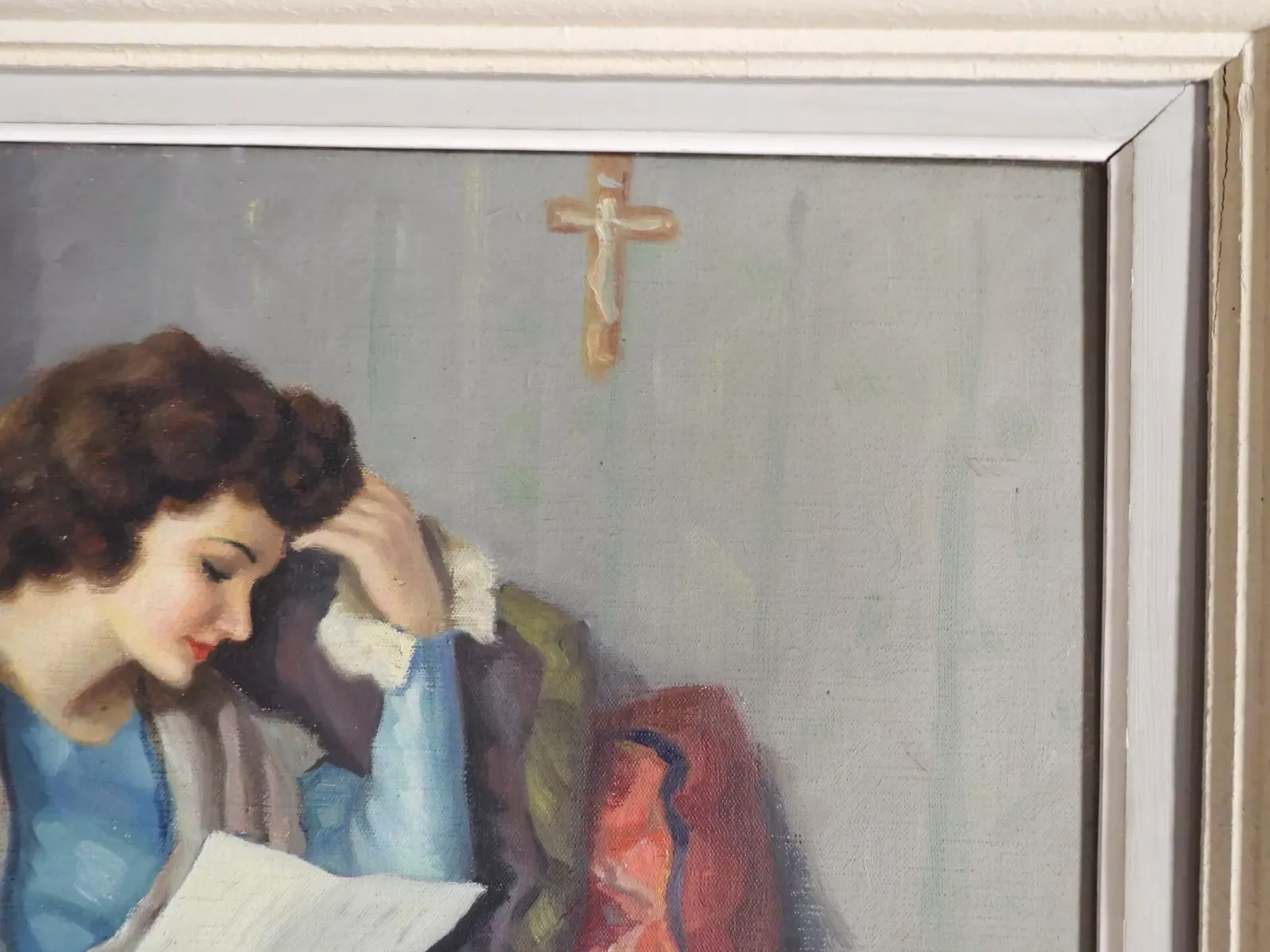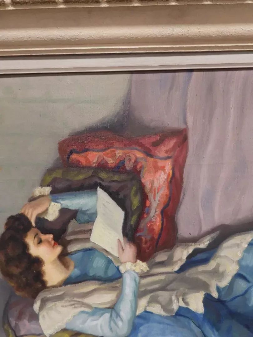 Très grande huile sur toile de Joan MAYOR (XX) « Femme à la lecture dans son intérieur ». Signée et datée 1948 en bas à droite. 115 x 80 avec le cadre ( à vue, 98×62)