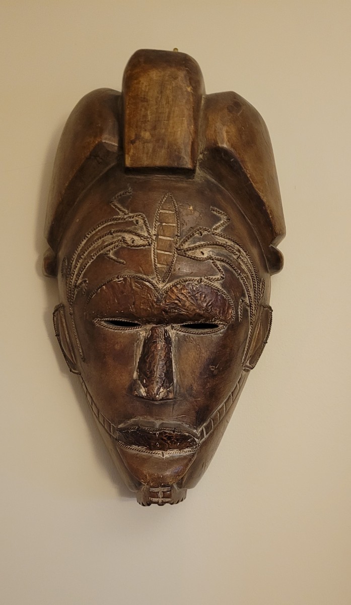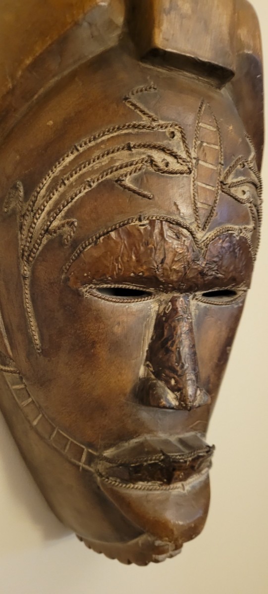 Masque authentique d’Afrique de l’Ouest, usage rituel ou cérémoniel, XXe siècle (probablement première moitié). Motifs cordés (incisions torsadées) typiques des masques ivoiriens (Baoulé / Guro).